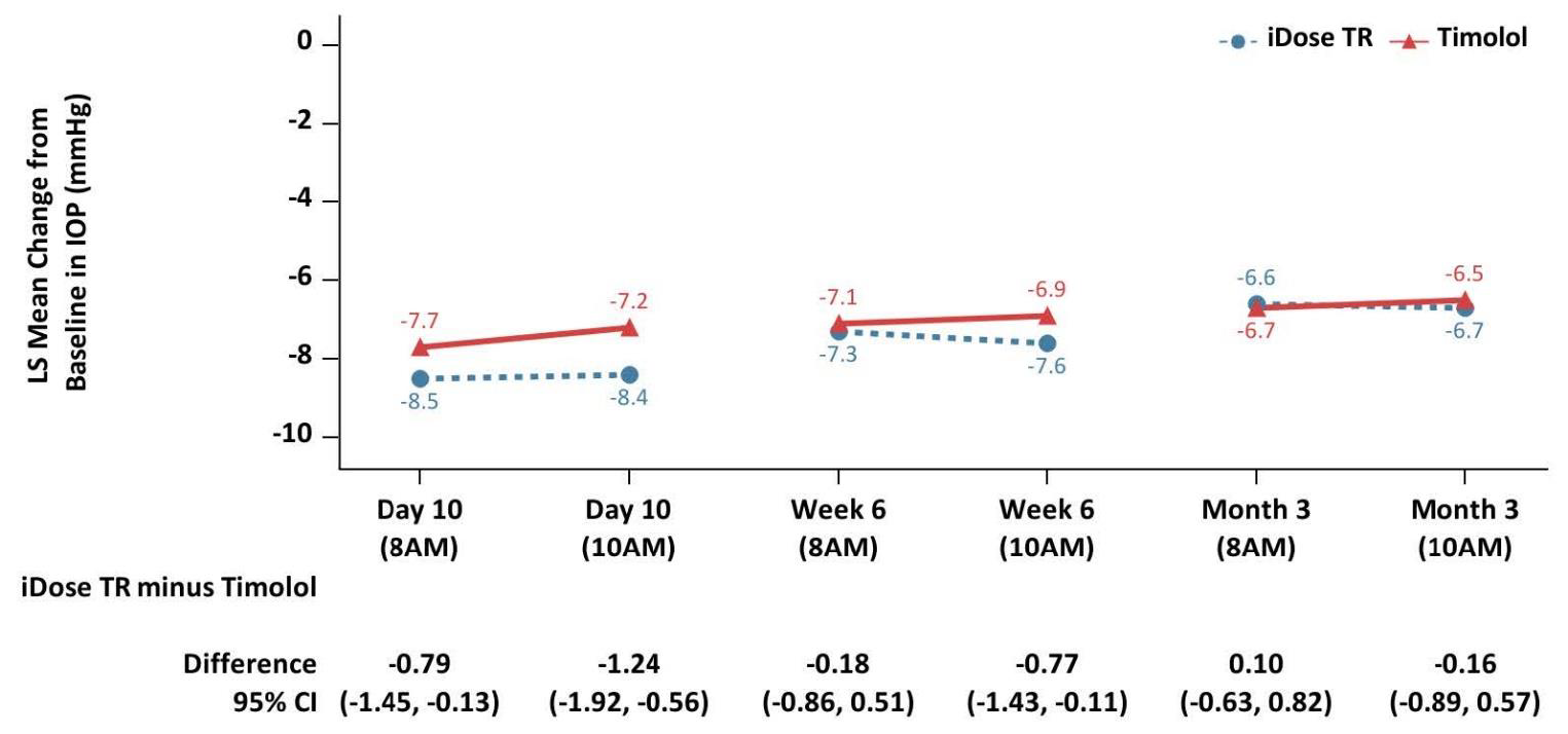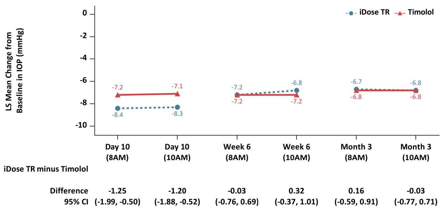 iDose TR demonstrated non-inferiority to timolol ophthalmic solution in IOP reduction during the first 3 months. Subsequently, iDose TR did not demonstrate non-inferiority over the next 9 months.